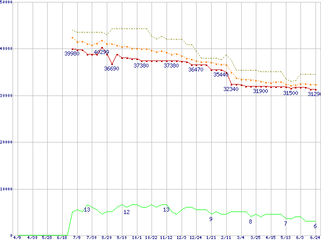 ※このグラフは過去のデータも税率5%相当に調整した税込み相当額のグラフです。 税率変更や、総額表示方式導入(2004年4月)の影響は除いています。 | | | ●凡例 | 最安値 (点線部は販売店未確認 または未調査) | 平均値 | 最高値 | ショップ数 |