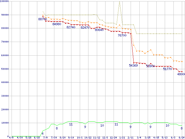※このグラフは過去のデータも税率5%相当に調整した税込み相当額のグラフです。 税率変更や、総額表示方式導入(2004年4月)の影響は除いています。 | | | ●凡例 | 最安値 (点線部は販売店未確認 または未調査) | 平均値 | 最高値 | ショップ数 |