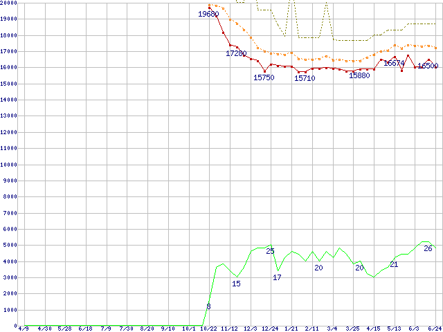 ※このグラフは過去のデータも税率5%相当に調整した税込み相当額のグラフです。 税率変更や、総額表示方式導入(2004年4月)の影響は除いています。 | | | ●凡例 | 最安値 (点線部は販売店未確認 または未調査) | 平均値 | 最高値 | ショップ数 |