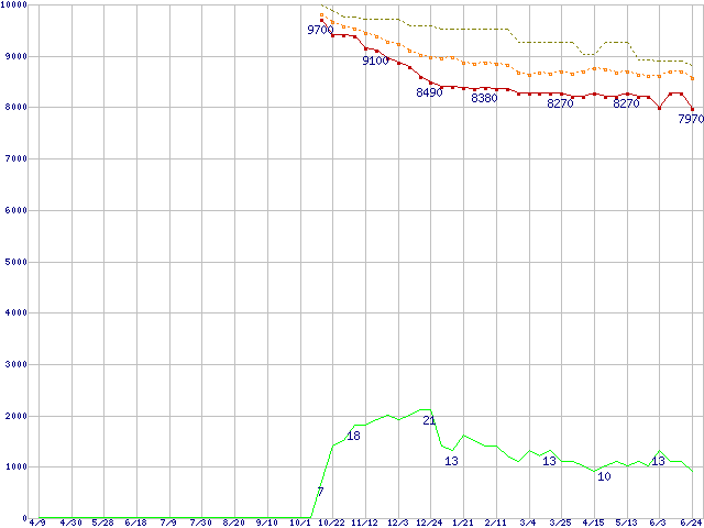 ※このグラフは過去のデータも税率5%相当に調整した税込み相当額のグラフです。 税率変更や、総額表示方式導入(2004年4月)の影響は除いています。 | | | ●凡例 | 最安値 (点線部は販売店未確認 または未調査) | 平均値 | 最高値 | ショップ数 |