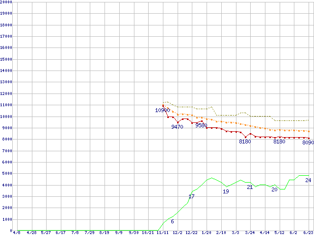 ※このグラフは過去のデータも税率5%相当に調整した税込み相当額のグラフです。 税率変更や、総額表示方式導入(2004年4月)の影響は除いています。 | | | ●凡例 | 最安値 (点線部は販売店未確認 または未調査) | 平均値 | 最高値 | ショップ数 |