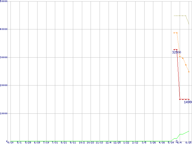 ※このグラフは過去のデータも税率5%相当に調整した税込み相当額のグラフです。 税率変更や、総額表示方式導入(2004年4月)の影響は除いています。 | | | ●凡例 | 最安値 (点線部は販売店未確認 または未調査) | 平均値 | 最高値 | ショップ数 |