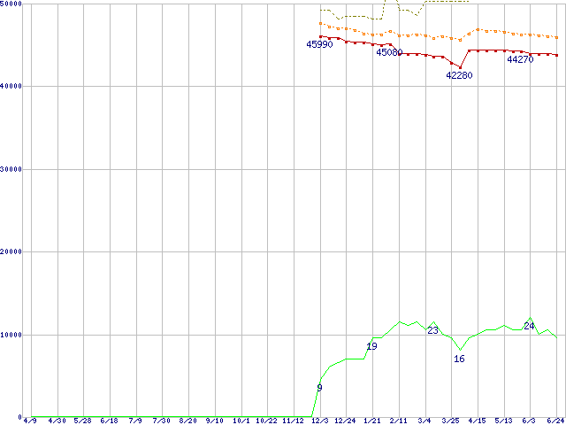 | Pentium 4 560J (3.60GHz) リテールパッケージの価格推移 | | | (2004年4月9日~2005年6月24日) |