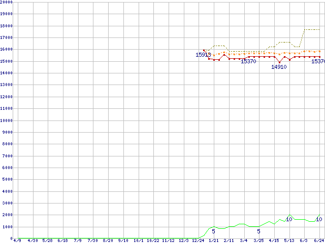 ※このグラフは過去のデータも税率5%相当に調整した税込み相当額のグラフです。 税率変更や、総額表示方式導入(2004年4月)の影響は除いています。 | | | ●凡例 | 最安値 (点線部は販売店未確認 または未調査) | 平均値 | 最高値 | ショップ数 |