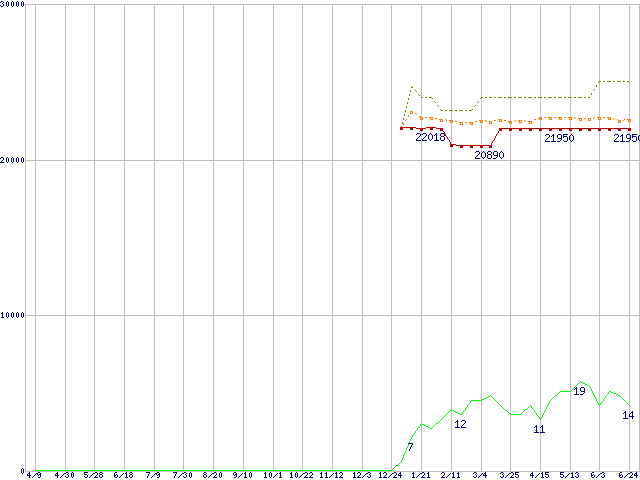 ※このグラフは過去のデータも税率5%相当に調整した税込み相当額のグラフです。 税率変更や、総額表示方式導入(2004年4月)の影響は除いています。 | | | ●凡例 | 最安値 (点線部は販売店未確認 または未調査) | 平均値 | 最高値 | ショップ数 |