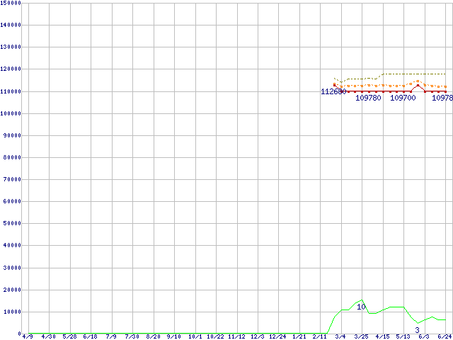 ※このグラフは過去のデータも税率5%相当に調整した税込み相当額のグラフです。 税率変更や、総額表示方式導入(2004年4月)の影響は除いています。 | | | ●凡例 | 最安値 (点線部は販売店未確認 または未調査) | 平均値 | 最高値 | ショップ数 |