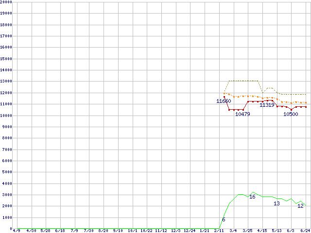 | Sempron 3000+(1.8GHz,L2 128KB,Socket 754) リテールパッケージの価格推移 | | | (2004年4月9日~2005年6月24日) |