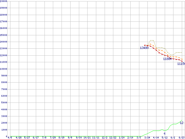 ※このグラフは過去のデータも税率5%相当に調整した税込み相当額のグラフです。 税率変更や、総額表示方式導入(2004年4月)の影響は除いています。 | | | ●凡例 | 最安値 (点線部は販売店未確認 または未調査) | 平均値 | 最高値 | ショップ数 |