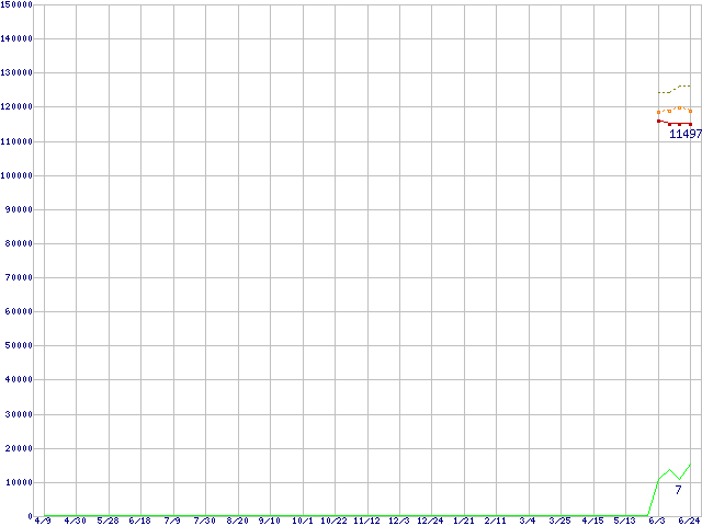 ※このグラフは過去のデータも税率5%相当に調整した税込み相当額のグラフです。 税率変更や、総額表示方式導入(2004年4月)の影響は除いています。 | | | ●凡例 | 最安値 (点線部は販売店未確認 または未調査) | 平均値 | 最高値 | ショップ数 |