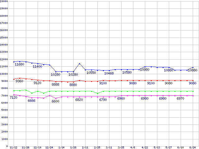 | Socket 478 (FC-PGA2,FSB 400MHz,L2 128KB,Northwood)の最安値推移 | | | (2004年11月12日~2005年6月24日) |
