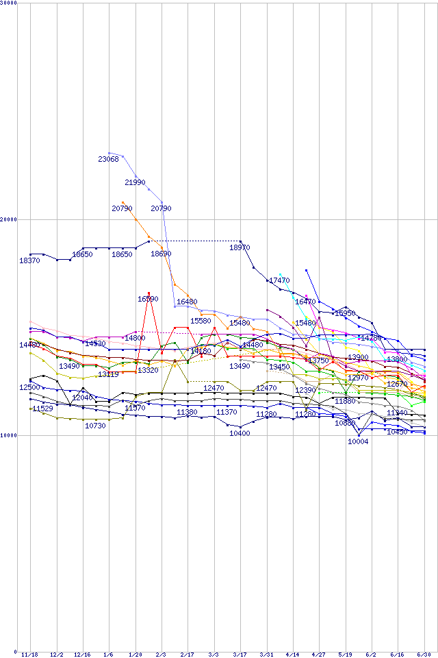 | HDD主要製品(最安値1万円~1万5千円未満)の最安値推移 | | | (2004年11月18日~2005年6月30日) |