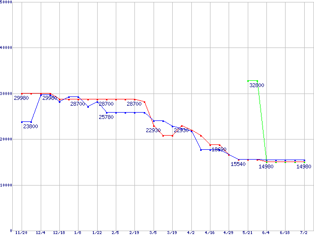 メモリ主要製品(最安値1万円以上)の最安値推移