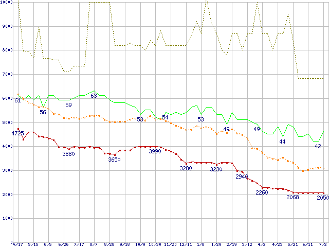 ※このグラフは過去のデータも税率5%相当に調整した税込み相当額のグラフです。 税率変更や、総額表示方式導入(2004年4月)の影響は除いています。 | | | ●凡例 | 最安値 (点線部は販売店未確認 または未調査) | 平均値 | 最高値 | ショップ数 |