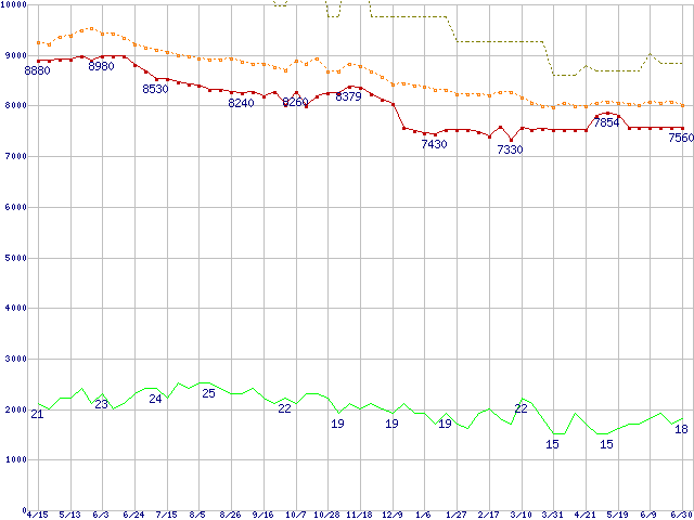 ※このグラフは過去のデータも税率5%相当に調整した税込み相当額のグラフです。 税率変更や、総額表示方式導入(2004年4月)の影響は除いています。 | | | ●凡例 | 最安値 (点線部は販売店未確認 または未調査) | 平均値 | 最高値 | ショップ数 |