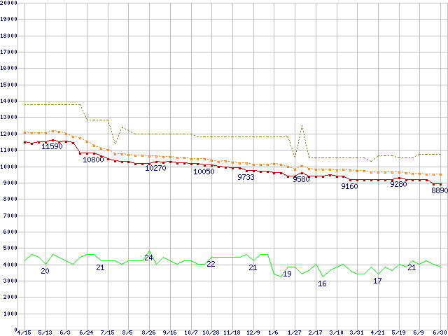 ※このグラフは過去のデータも税率5%相当に調整した税込み相当額のグラフです。 税率変更や、総額表示方式導入(2004年4月)の影響は除いています。 | | | ●凡例 | 最安値 (点線部は販売店未確認 または未調査) | 平均値 | 最高値 | ショップ数 |