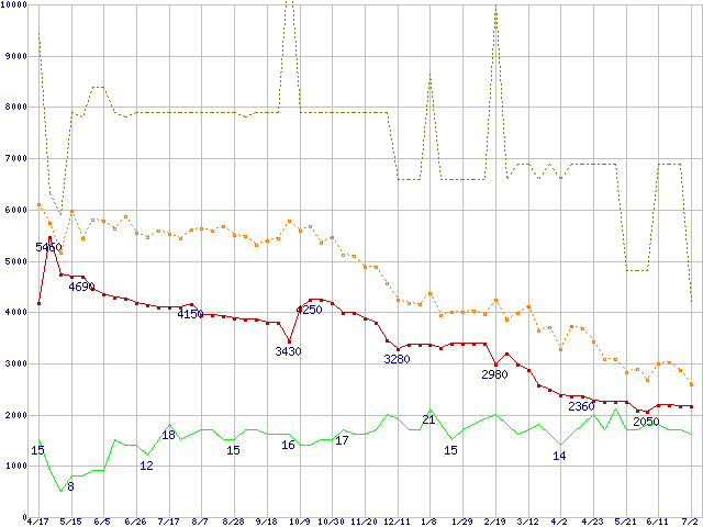 ※このグラフは過去のデータも税率5%相当に調整した税込み相当額のグラフです。 税率変更や、総額表示方式導入(2004年4月)の影響は除いています。 | | | ●凡例 | 最安値 (点線部は販売店未確認 または未調査) | 平均値 | 最高値 | ショップ数 |