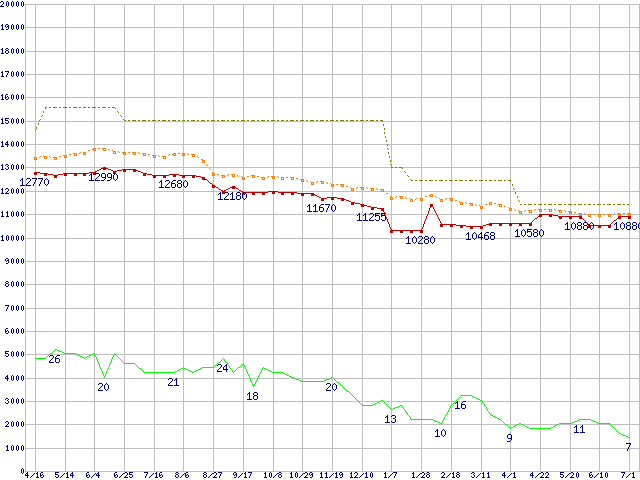 ※このグラフは過去のデータも税率5%相当に調整した税込み相当額のグラフです。 税率変更や、総額表示方式導入(2004年4月)の影響は除いています。 | | | ●凡例 | 最安値 (点線部は販売店未確認 または未調査) | 平均値 | 最高値 | ショップ数 |