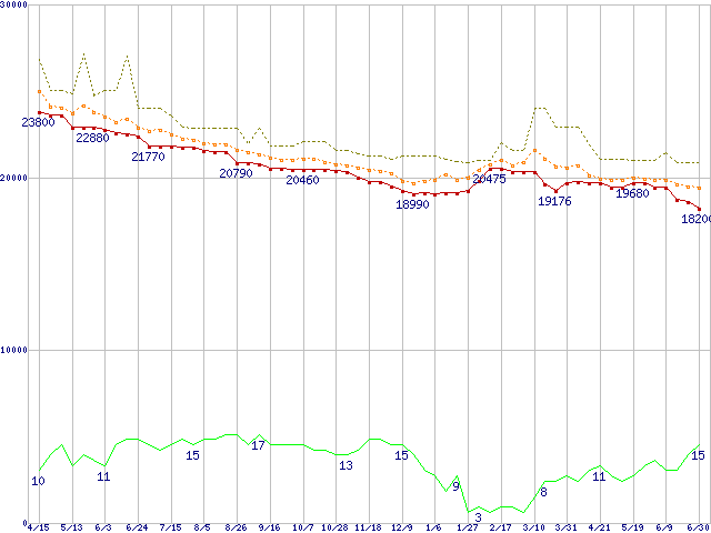 ※このグラフは過去のデータも税率5%相当に調整した税込み相当額のグラフです。 税率変更や、総額表示方式導入(2004年4月)の影響は除いています。 | | | ●凡例 | 最安値 (点線部は販売店未確認 または未調査) | 平均値 | 最高値 | ショップ数 |