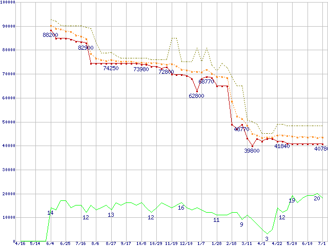 | Athlon 64 3800+(2.4GHz,L2 512KB)の価格推移 | | | (2004年4月16日~2005年7月1日) |