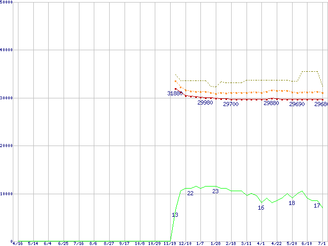 ※このグラフは過去のデータも税率5%相当に調整した税込み相当額のグラフです。 税率変更や、総額表示方式導入(2004年4月)の影響は除いています。 | | | ●凡例 | 最安値 (点線部は販売店未確認 または未調査) | 平均値 | 最高値 | ショップ数 |