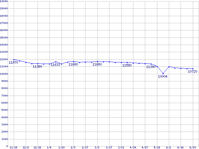| Barracuda 7200.7 Plus (7200rpm,Ultra ATA/100,8MB,100GB/Platter)の最安値推移 | | | (2004年11月18日~2005年6月30日) |