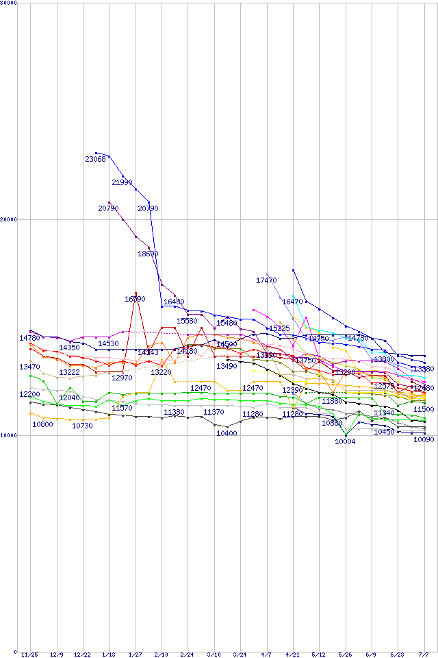 | HDD主要製品(最安値1万円~1万5千円未満)の最安値推移 | | | (2004年11月25日~2005年7月7日) |