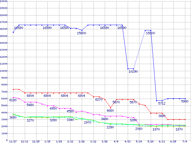 メモリ主要製品(最安値5千円未満)の最安値推移