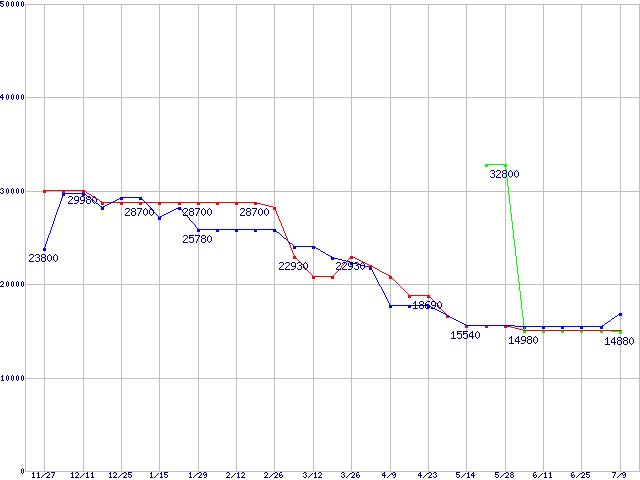 メモリ主要製品(最安値1万円以上)の最安値推移
