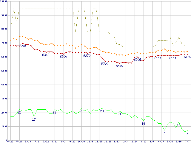 ※このグラフは過去のデータも税率5%相当に調整した税込み相当額のグラフです。 税率変更や、総額表示方式導入(2004年4月)の影響は除いています。 | | | ●凡例 | 最安値 (点線部は販売店未確認 または未調査) | 平均値 | 最高値 | ショップ数 |