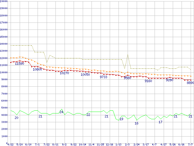 ※このグラフは過去のデータも税率5%相当に調整した税込み相当額のグラフです。 税率変更や、総額表示方式導入(2004年4月)の影響は除いています。 | | | ●凡例 | 最安値 (点線部は販売店未確認 または未調査) | 平均値 | 最高値 | ショップ数 |