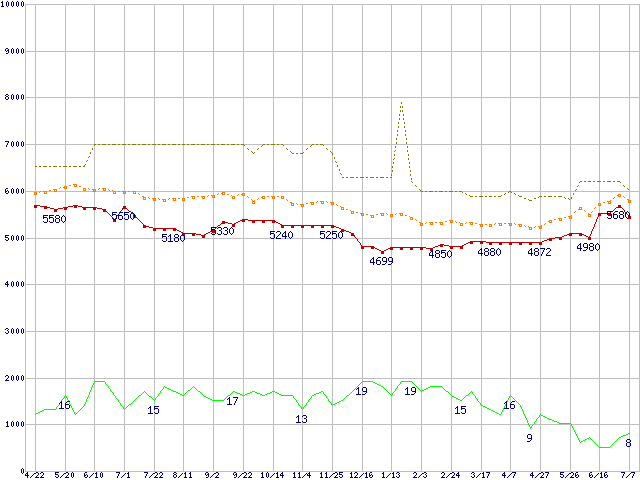 ※このグラフは過去のデータも税率5%相当に調整した税込み相当額のグラフです。 税率変更や、総額表示方式導入(2004年4月)の影響は除いています。 | | | ●凡例 | 最安値 (点線部は販売店未確認 または未調査) | 平均値 | 最高値 | ショップ数 |