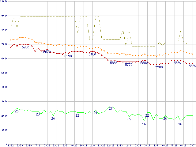 ※このグラフは過去のデータも税率5%相当に調整した税込み相当額のグラフです。 税率変更や、総額表示方式導入(2004年4月)の影響は除いています。 | | | ●凡例 | 最安値 (点線部は販売店未確認 または未調査) | 平均値 | 最高値 | ショップ数 |