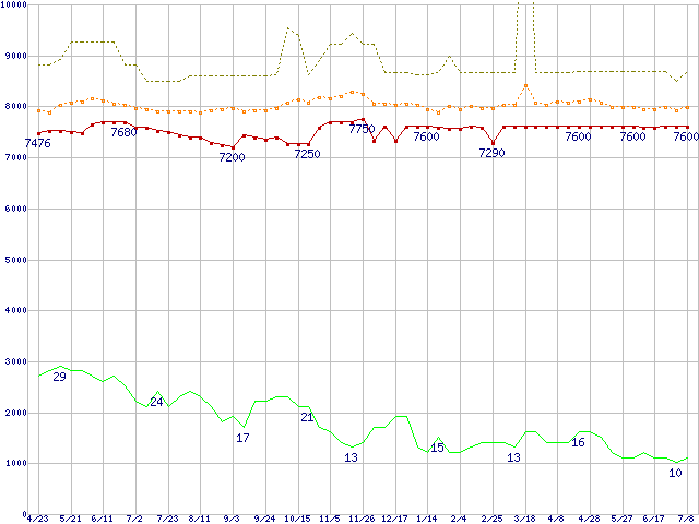 ※このグラフは過去のデータも税率5%相当に調整した税込み相当額のグラフです。 税率変更や、総額表示方式導入(2004年4月)の影響は除いています。 | | | ●凡例 | 最安値 (点線部は販売店未確認 または未調査) | 平均値 | 最高値 | ショップ数 |