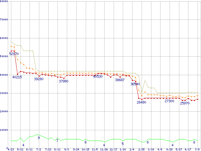 ※このグラフは過去のデータも税率5%相当に調整した税込み相当額のグラフです。 税率変更や、総額表示方式導入(2004年4月)の影響は除いています。 | | | ●凡例 | 最安値 (点線部は販売店未確認 または未調査) | 平均値 | 最高値 | ショップ数 |