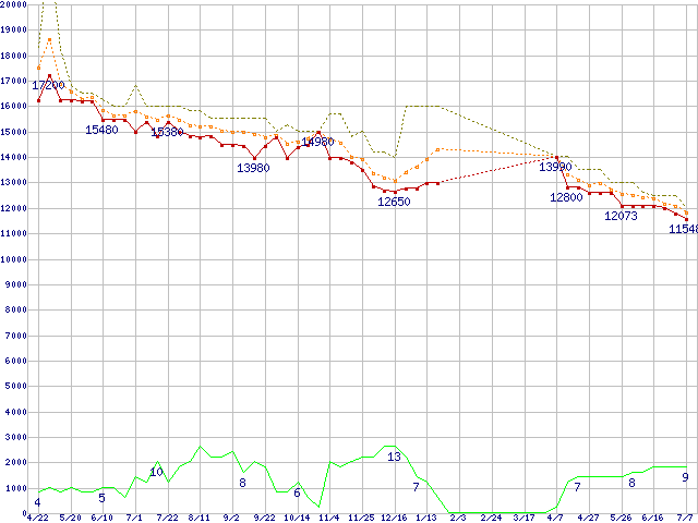 ※このグラフは過去のデータも税率5%相当に調整した税込み相当額のグラフです。 税率変更や、総額表示方式導入(2004年4月)の影響は除いています。 | | | ●凡例 | 最安値 (点線部は販売店未確認 または未調査) | 平均値 | 最高値 | ショップ数 |