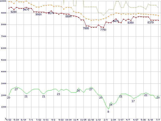 ※このグラフは過去のデータも税率5%相当に調整した税込み相当額のグラフです。 税率変更や、総額表示方式導入(2004年4月)の影響は除いています。 | | | ●凡例 | 最安値 (点線部は販売店未確認 または未調査) | 平均値 | 最高値 | ショップ数 |