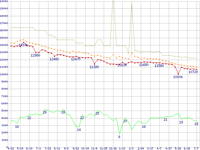 ※このグラフは過去のデータも税率5%相当に調整した税込み相当額のグラフです。 税率変更や、総額表示方式導入(2004年4月)の影響は除いています。 | | | ●凡例 | 最安値 (点線部は販売店未確認 または未調査) | 平均値 | 最高値 | ショップ数 |