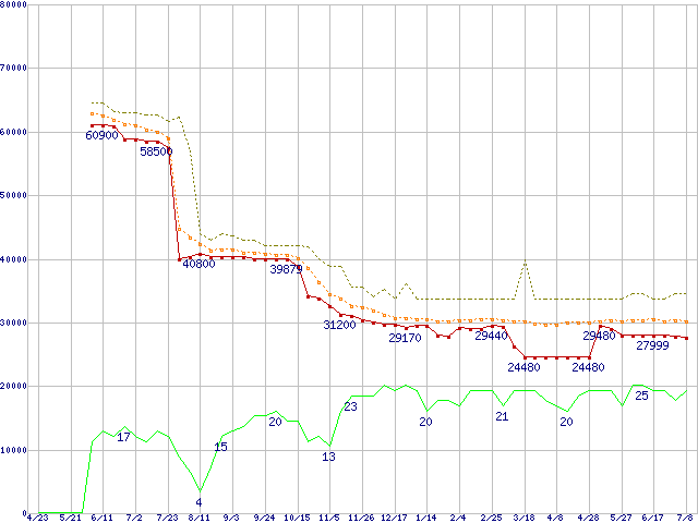 | Athlon 64 3500+(2.2GHz,L2 512KB)の価格推移 | | | (2004年4月23日~2005年7月8日) |