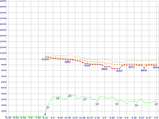 ※このグラフは過去のデータも税率5%相当に調整した税込み相当額のグラフです。 税率変更や、総額表示方式導入(2004年4月)の影響は除いています。 | | | ●凡例 | 最安値 (点線部は販売店未確認 または未調査) | 平均値 | 最高値 | ショップ数 |