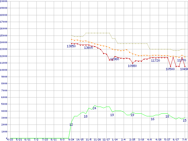 ※このグラフは過去のデータも税率5%相当に調整した税込み相当額のグラフです。 税率変更や、総額表示方式導入(2004年4月)の影響は除いています。 | | | ●凡例 | 最安値 (点線部は販売店未確認 または未調査) | 平均値 | 最高値 | ショップ数 |