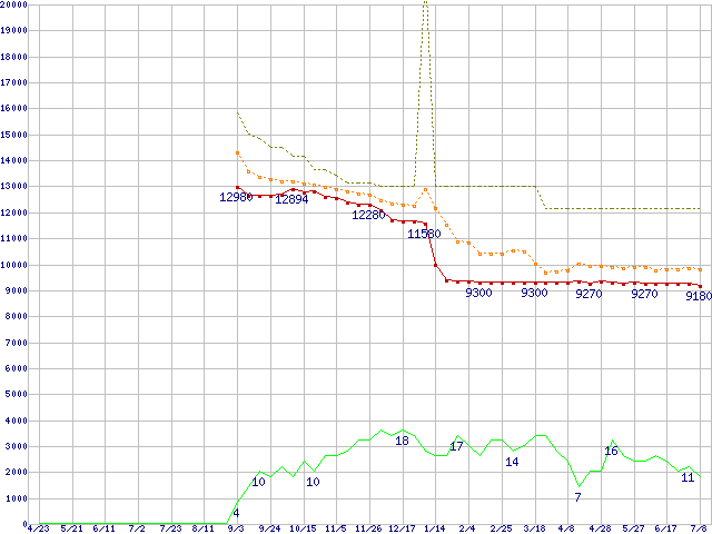 ※このグラフは過去のデータも税率5%相当に調整した税込み相当額のグラフです。 税率変更や、総額表示方式導入(2004年4月)の影響は除いています。 | | | ●凡例 | 最安値 (点線部は販売店未確認 または未調査) | 平均値 | 最高値 | ショップ数 |