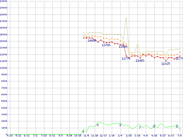 ※このグラフは過去のデータも税率5%相当に調整した税込み相当額のグラフです。 税率変更や、総額表示方式導入(2004年4月)の影響は除いています。 | | | ●凡例 | 最安値 (点線部は販売店未確認 または未調査) | 平均値 | 最高値 | ショップ数 |