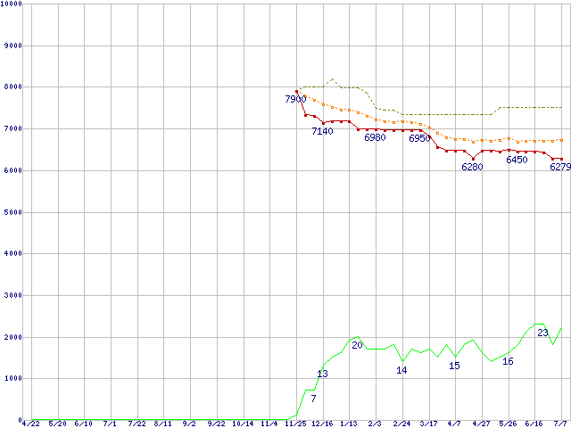 ※このグラフは過去のデータも税率5%相当に調整した税込み相当額のグラフです。 税率変更や、総額表示方式導入(2004年4月)の影響は除いています。 | | | ●凡例 | 最安値 (点線部は販売店未確認 または未調査) | 平均値 | 最高値 | ショップ数 |