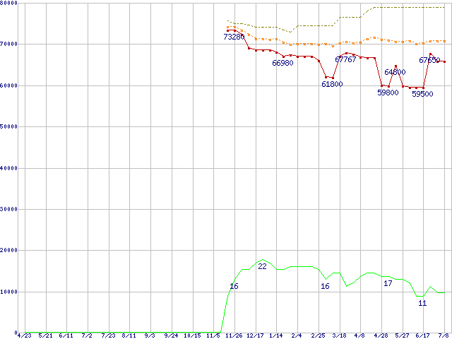 ※このグラフは過去のデータも税率5%相当に調整した税込み相当額のグラフです。 税率変更や、総額表示方式導入(2004年4月)の影響は除いています。 | | | ●凡例 | 最安値 (点線部は販売店未確認 または未調査) | 平均値 | 最高値 | ショップ数 |