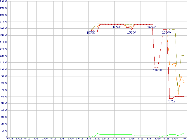 ※このグラフは過去のデータも税率5%相当に調整した税込み相当額のグラフです。 税率変更や、総額表示方式導入(2004年4月)の影響は除いています。 | | | ●凡例 | 最安値 (点線部は販売店未確認 または未調査) | 平均値 | 最高値 | ショップ数 |