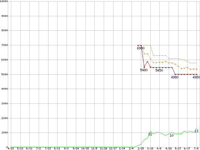 ※このグラフは過去のデータも税率5%相当に調整した税込み相当額のグラフです。 税率変更や、総額表示方式導入(2004年4月)の影響は除いています。 | | | ●凡例 | 最安値 (点線部は販売店未確認 または未調査) | 平均値 | 最高値 | ショップ数 |