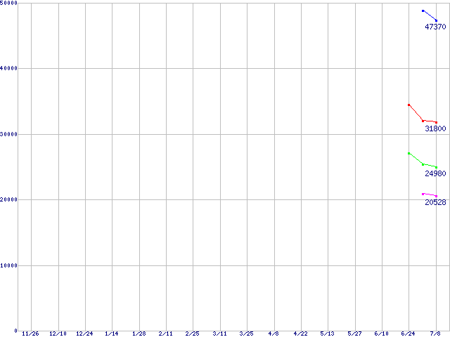 | LGA 775 (FC-LGA4 ,FSB 800MHz,L2 1MB,Hyper-Threading,Prescott,EM64T・NX bit対応)の最安値推移 | | | (2004年11月26日~2005年7月8日) |