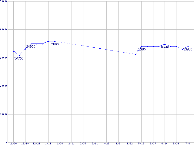 | Socket 478 (FC-PGA2,FSB 800MHz,L2 512KB,Hyper-Threading,Northwood)の最安値推移 | | | (2004年11月26日~2005年7月8日) |