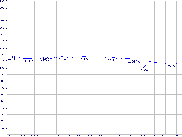 | Barracuda 7200.7 Plus (7200rpm,Ultra ATA/100,8MB,100GB/Platter)の最安値推移 | | | (2004年11月25日~2005年7月7日) |