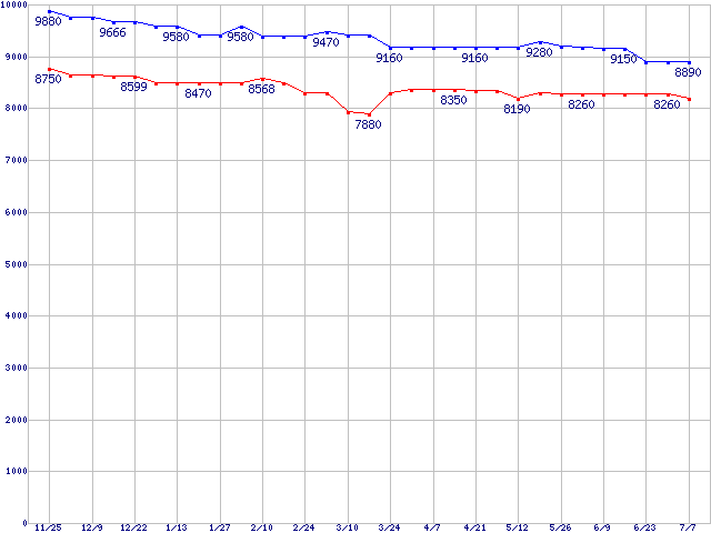 | Barracuda 7200.7 Plus (7200rpm,Ultra ATA/100,8MB,80GB/Platter)の最安値推移 | | | (2004年11月25日~2005年7月7日) |